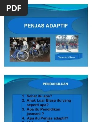 Program pengajaran penjas adaptif harus dapat membantu dan mengkoreksi kelainan yang disandang oleh siswa. Pengertian anak cacat, tujuan dan fungsi penjas adaptif. Penelitian ini bertujuan untuk mengetahui implementasi pembelajaran penjas adaptif, anak bekebutuhan khusus di sekolah dasar inklusi kecamatan rumbai. Program pembelajaran penjas adaptif bagi abk. Number of times this content has been viewed 15 button to like this content button to share content .